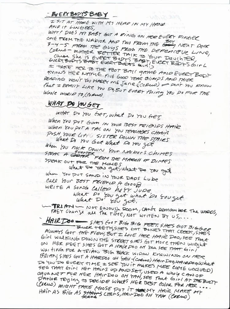 She’s got big big feet. She's got bigger buck teeth. She’s got bones that creak. She’s always got the flu. But I love her hairdo! See that girl walking down the street? She’s got more than weight on her feet: She’s got a hairdo, oh yeah! See that girl waiting for a train? Big black widow knawing on her brain: She’s got a hairdo, oh yeah! Hairdo, hairdo, what do you do? Every time I see you it makes me come unglued! See that girl? Her hair’s up and set. Used a whole can of Aquanet for her hairdo, on yeah! See that girl at the beauty parlor? Trying to decide what's her best color for her hairdo, on yeah! Hairdo, hairdo, what do you do? Every time I see you it makes me come unglued! Might take mousse, put it in my hair. Make my hair as big as Cher’s hairdo, oh yeah! Hairdo, hairdo, what do you do? Every time I see you it makes me come unglued!